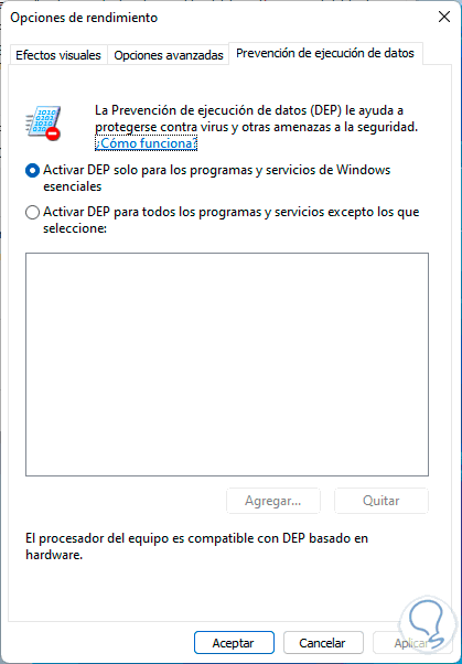 Para este caso accederemos a las opciones avanzadas del sistema a una función denominada DEP (Data Execution Prevention – Prevención de Ejecución de Datos), esta se ha desarrollado como una función de protección de la memoria la cual está integrada por defecto en Windows 11 y con ella es posible que el sistema determine que una o más aplicaciones o páginas de memoria se marquen como no ejecutables.
