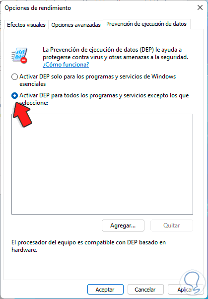 Activamos la casilla "Activar DEP para todos los programas y servicios excepto los que seleccione":