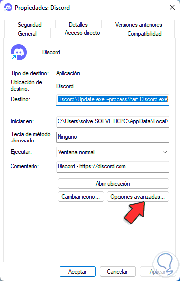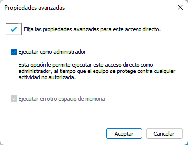 Damos clic en "Opciones avanzadas" y allí activamos la casilla "Ejecutar como administrador":