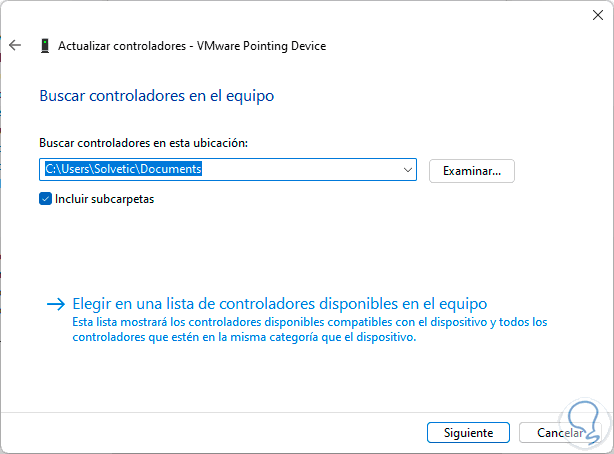 Damos clic en "Examinar mi PC en busca de controladores" y luego damos clic en "Elegir en una lista de controladores disponibles en el equipo":