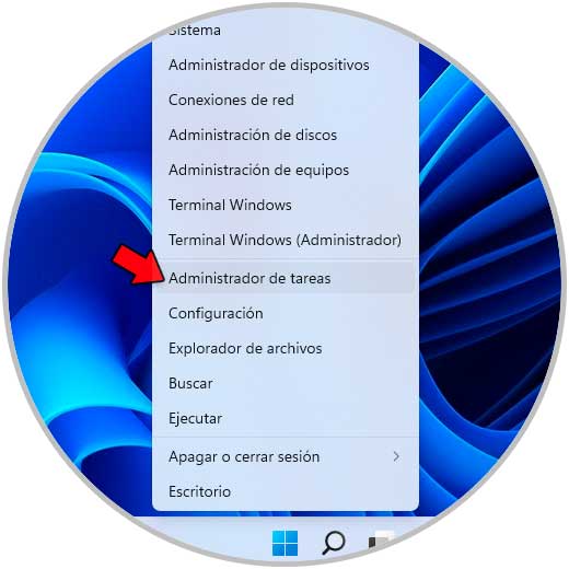 Abrimos el Administrador de tareas pulsando la tecla derecha (al final del tutorial te explicaremos cual es eta tecla) del teclado en Inicio: