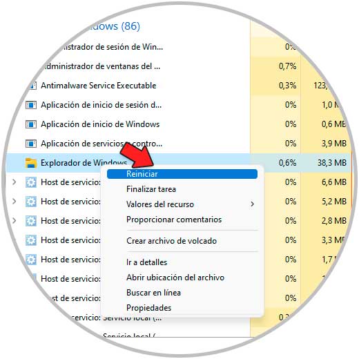 Seleccionamos el "Explorador de Windows" y con la tecla derecha del teclado seleccionamos "Reiniciar":