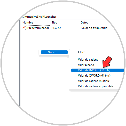 Con la tecla derecha del teclado seleccionamos "Nuevo - Valor de DWORD (32 bits)":