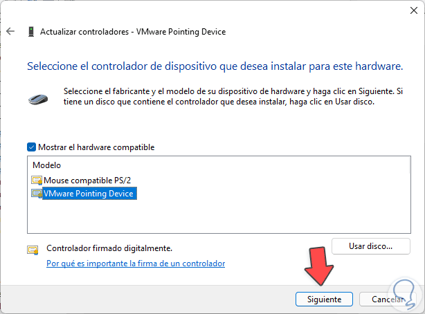 luego con Tabulador seleccionamos "Elegir en una lista de controladores disponibles en el equipo":