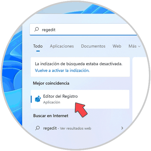 En el buscador ingresamos "regedit". Pulsamos Enter para abrirlo.