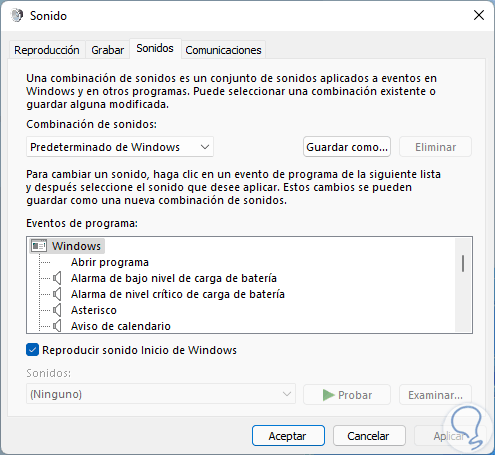 Podemos ver el sonido aplicado. Es posible dar clic en “Probar” para que tengamos conocimiento de cómo se oirá el sonido y si es el que deseamos para ese evento, aplicamos los cambios.