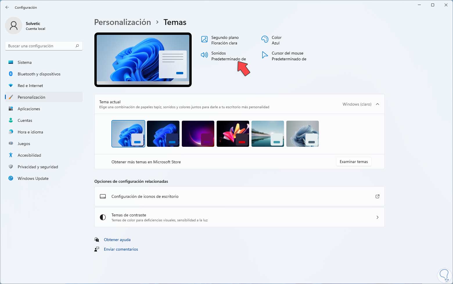 Al acceder a Temas, damos clic en "Sonidos predeterminados del sistema":