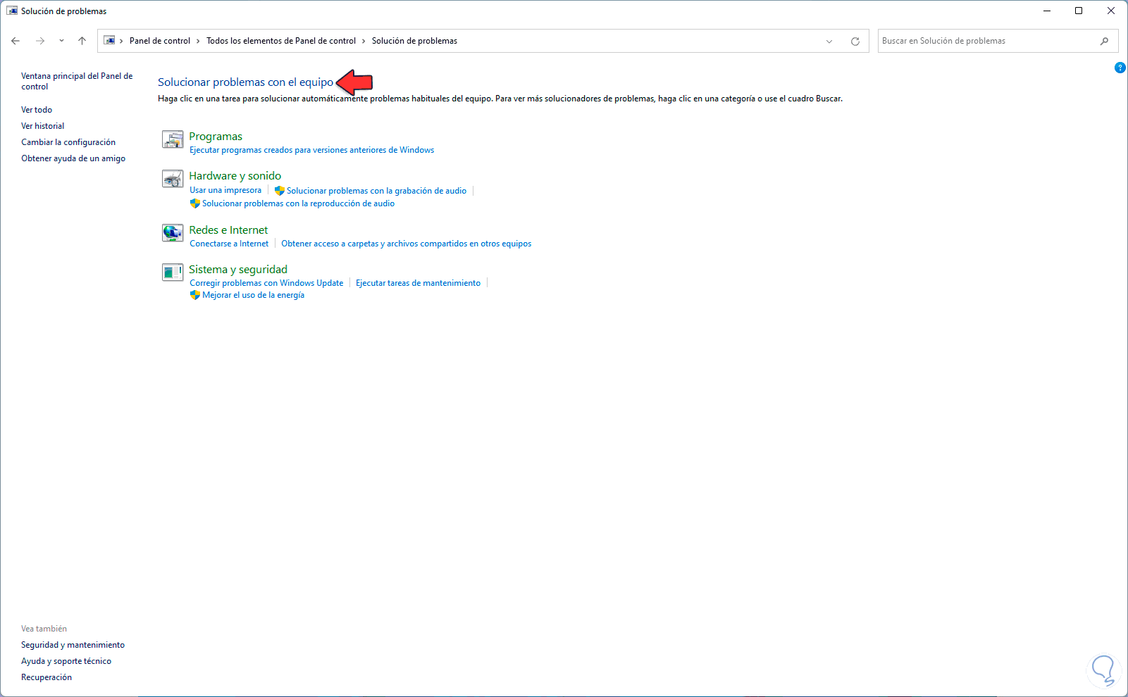 Damos clic en "Solución de problemas" y se abrirá lo siguiente: