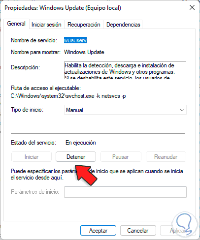 Validamos que esté detenido, si no es así, damos clic en "Detener", luego aplicamos los cambios.