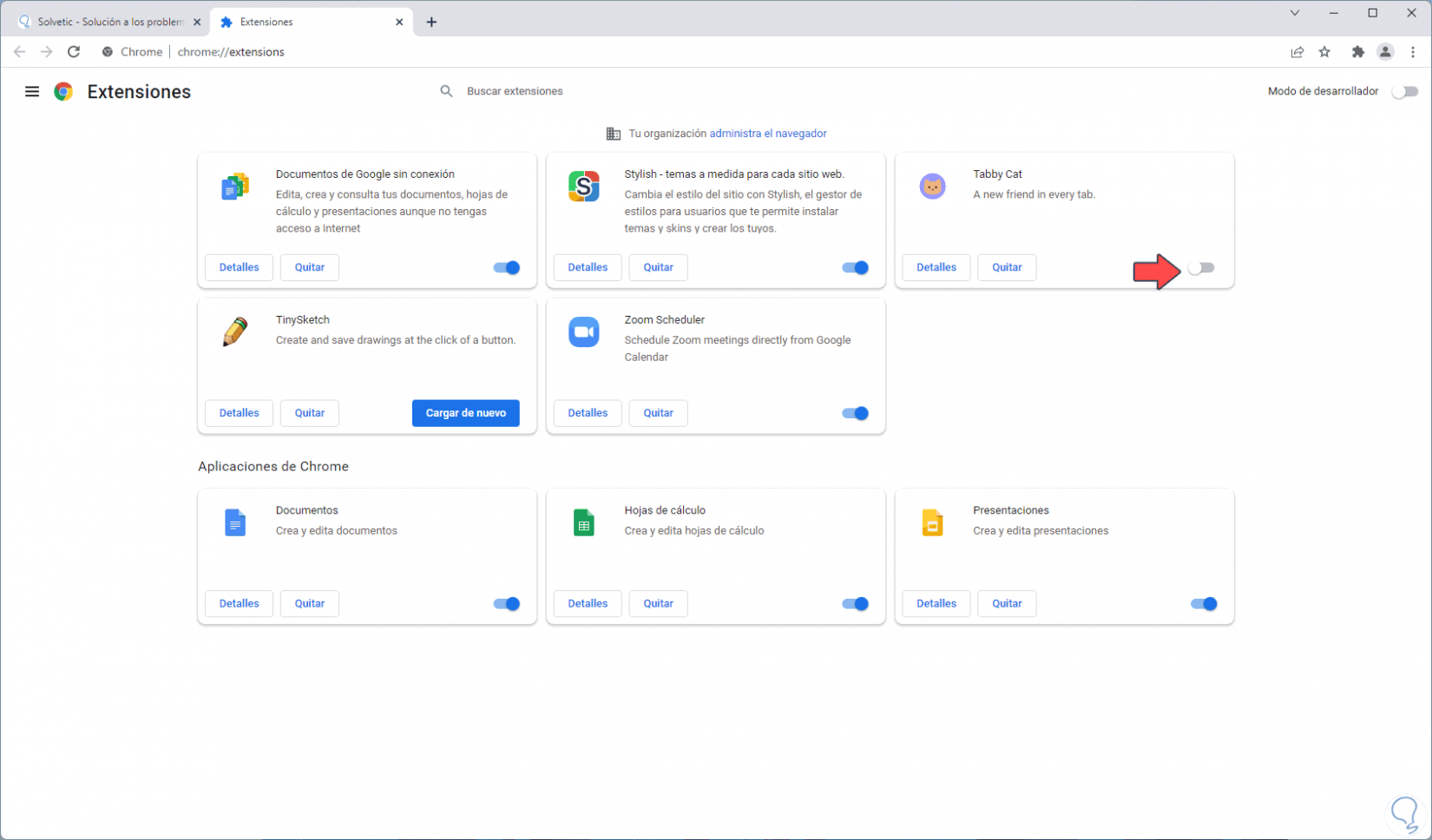 Allí es posible desactivar una extensión pulsando sobre el interruptor ubicado en la parte inferior de ella: