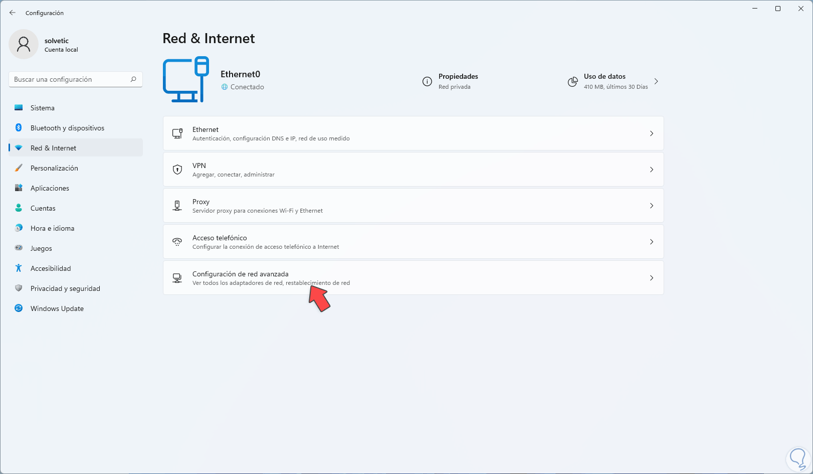 Iremos a “Red & Internet”. Damos clic en "Configuración de red avanzada"