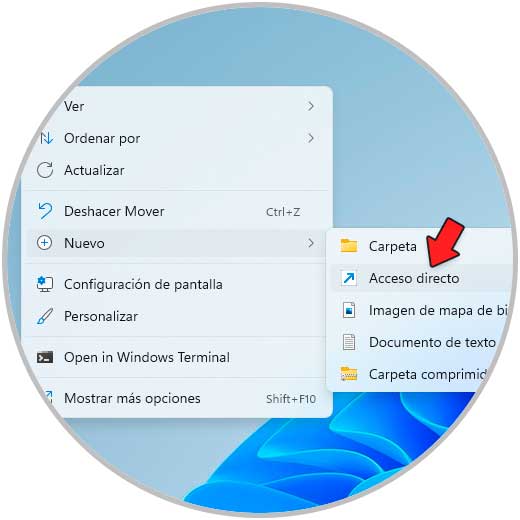 Para ello damos clic derecho en el escritorio y seleccionamos "Nuevo - Acceso directo":