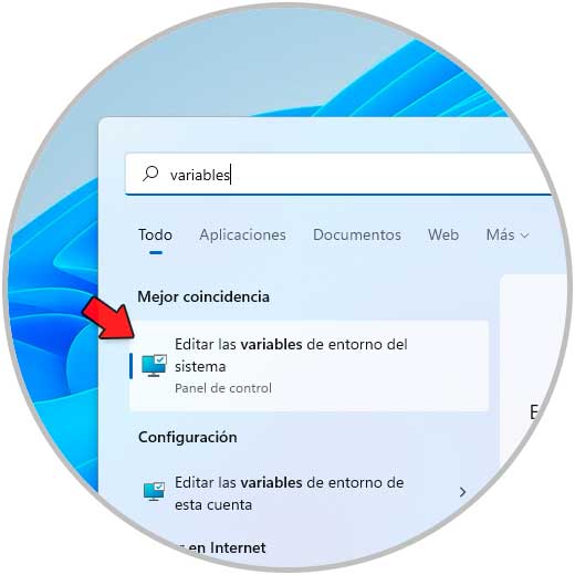 En el buscador ingresamos "variables" y allí seleccionamos "Editar las variables de entorno del sistema":