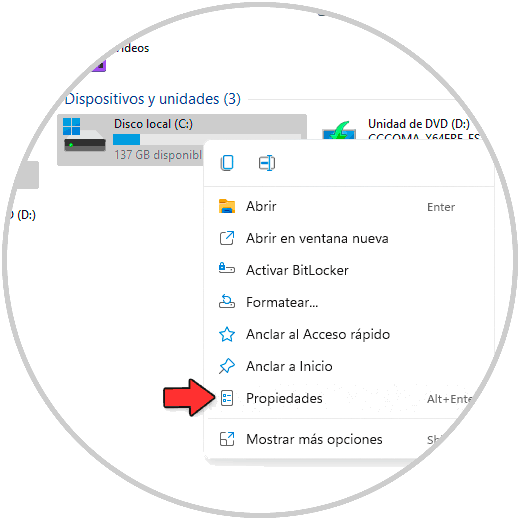 Para ello abrimos el Explorador de archivos, damos clic derecho sobre la unidad C y seleccionamos "Propiedades":