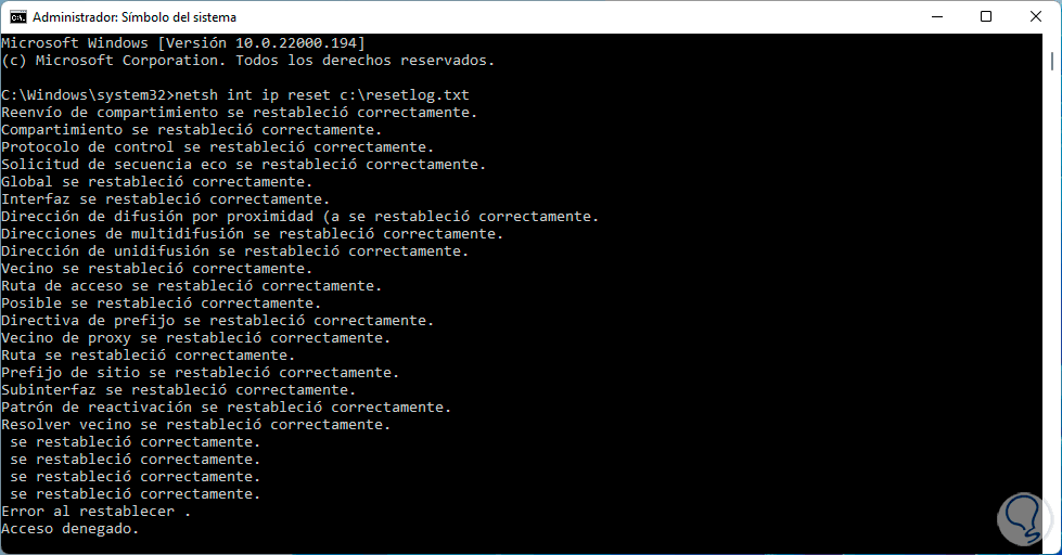 Ahora restablecemos Winsock: