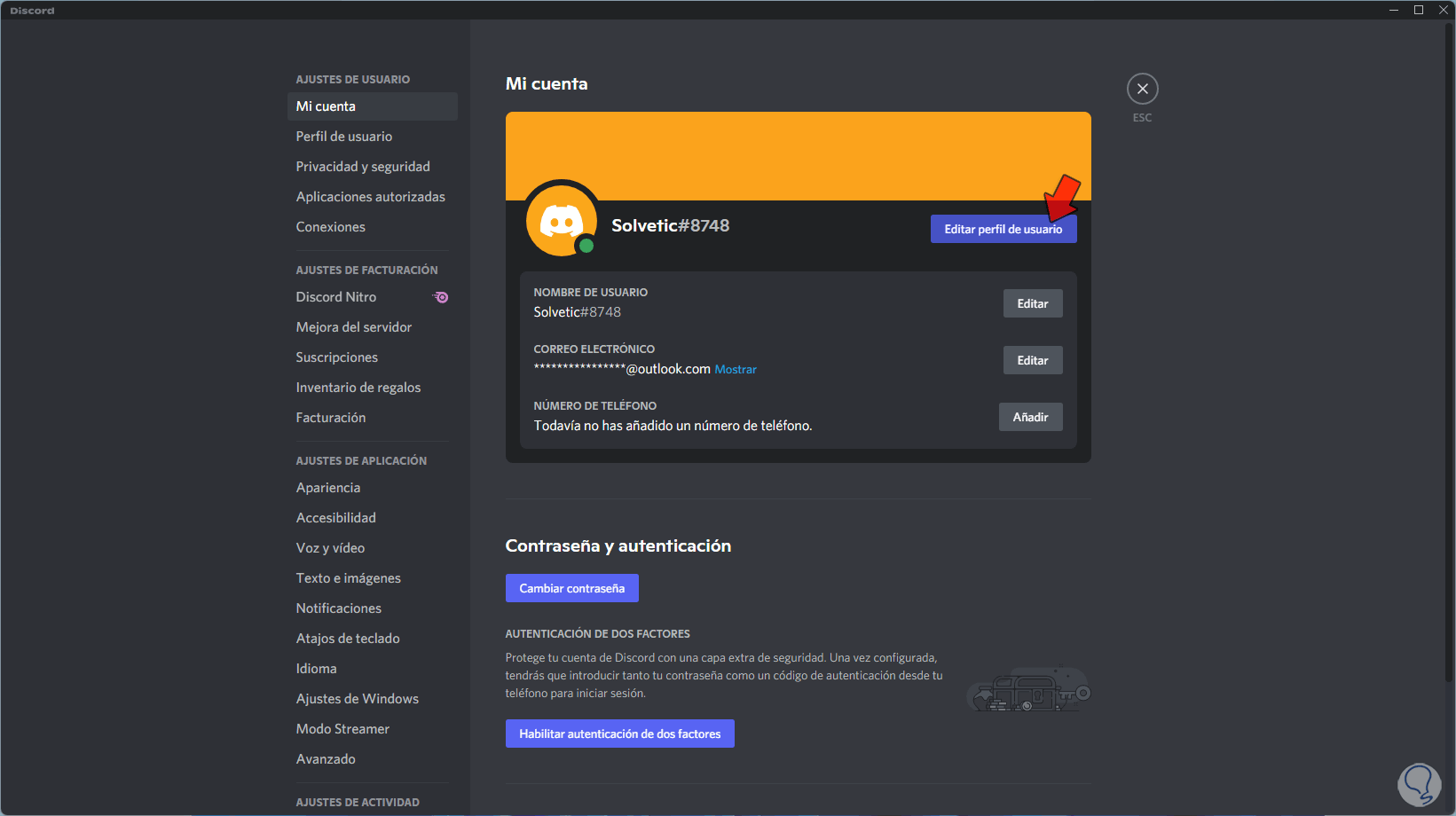 Veremos lo siguiente. Vamos a "Mi cuenta" y damos clic en "Editar perfil de usuario",