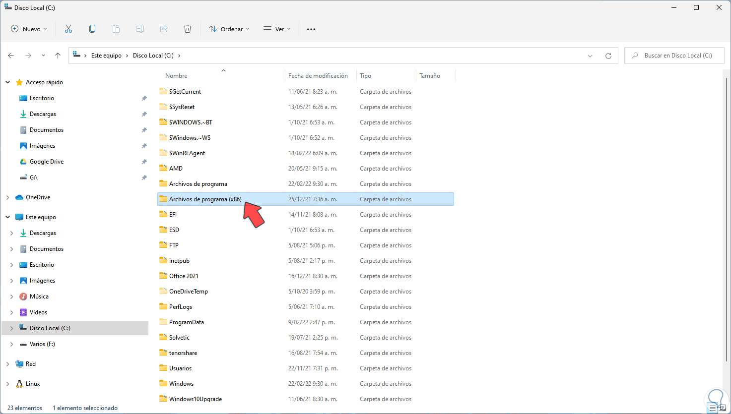 Este es un método muy funcional y simple conocer si nuestro Windows 11 es de 32 o 64 bits, abrimos el Explorador de archivos y si encontramos una carpeta (x86) en Archivos de programa el sistema es de 64 bits: