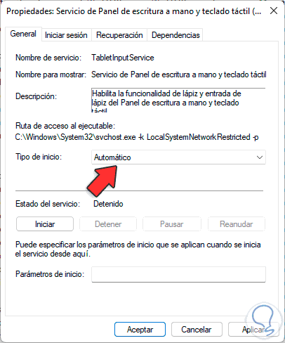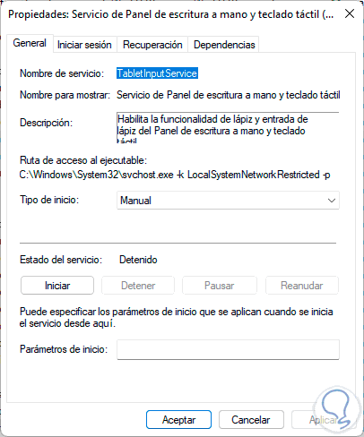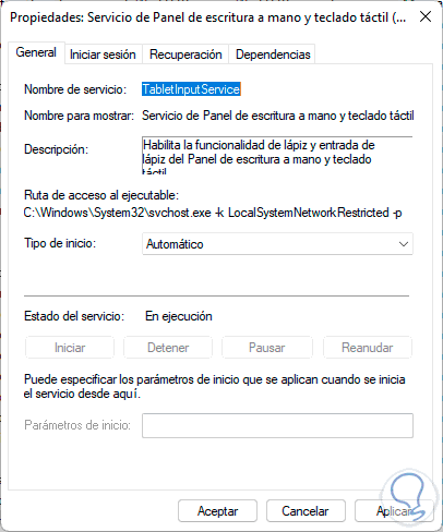 Este es un servicio que activa la funcionalidad de lápiz y entrada de lápiz del Panel de escritura a mano y teclado táctil en el sistema, como tal esto influye directamente en la escritura de la barra de tareas, damos doble clic sobre este para ver sus propiedades: