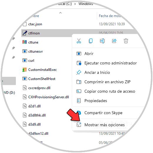 Para este paso abrimos el Explorador de archivos e iremos a "C:\Windows\System32", damos clic derecho sobre CTFMON y seleccionamos “Mostrar más opciones”: