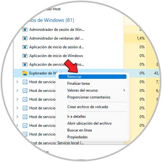 Damos clic derecho sobre "Explorador de Windows" y seleccionamos "Reiniciar":