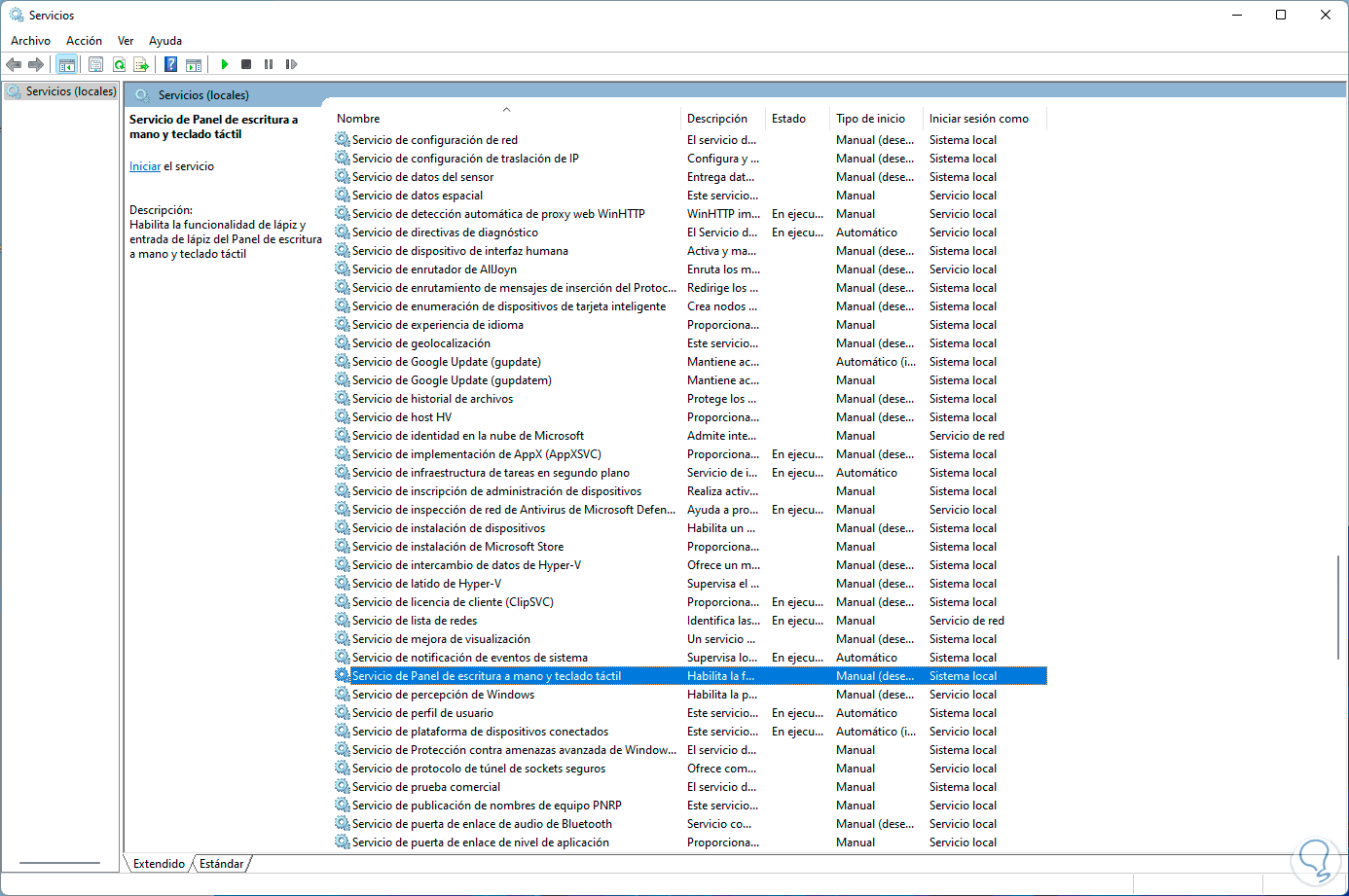 Ubicamos el servicio "Servicio de Panel de escritura a mano y teclado táctil":