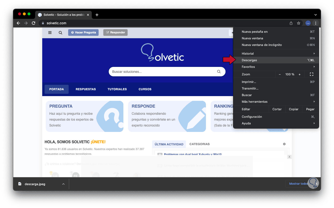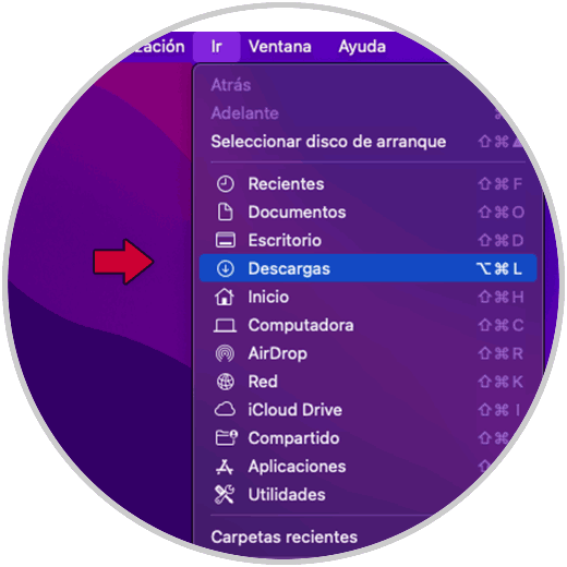 Para lograr esto existen diferentes opciones a usar, una opción para ir a Descargas es desde el menú "Ir - Descargas":