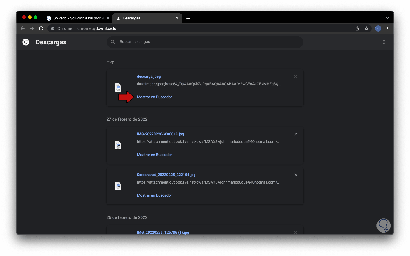 Veremos lo siguiente. Allí podemos dar clic en "Mostrar en Buscador" para ir a la carpeta.