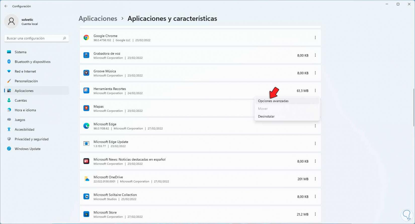 Damos clic derecho sobre "Herramienta Recortes" y seleccionamos "Opciones avanzadas":