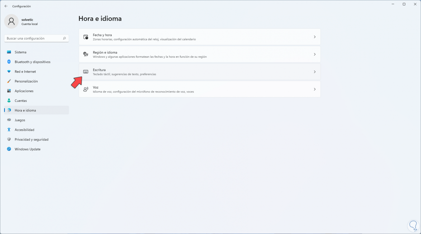 Allí vamos a “Hora e idioma – Escritura”: