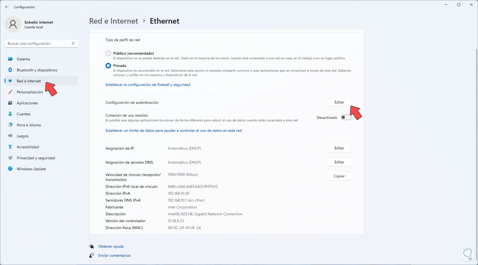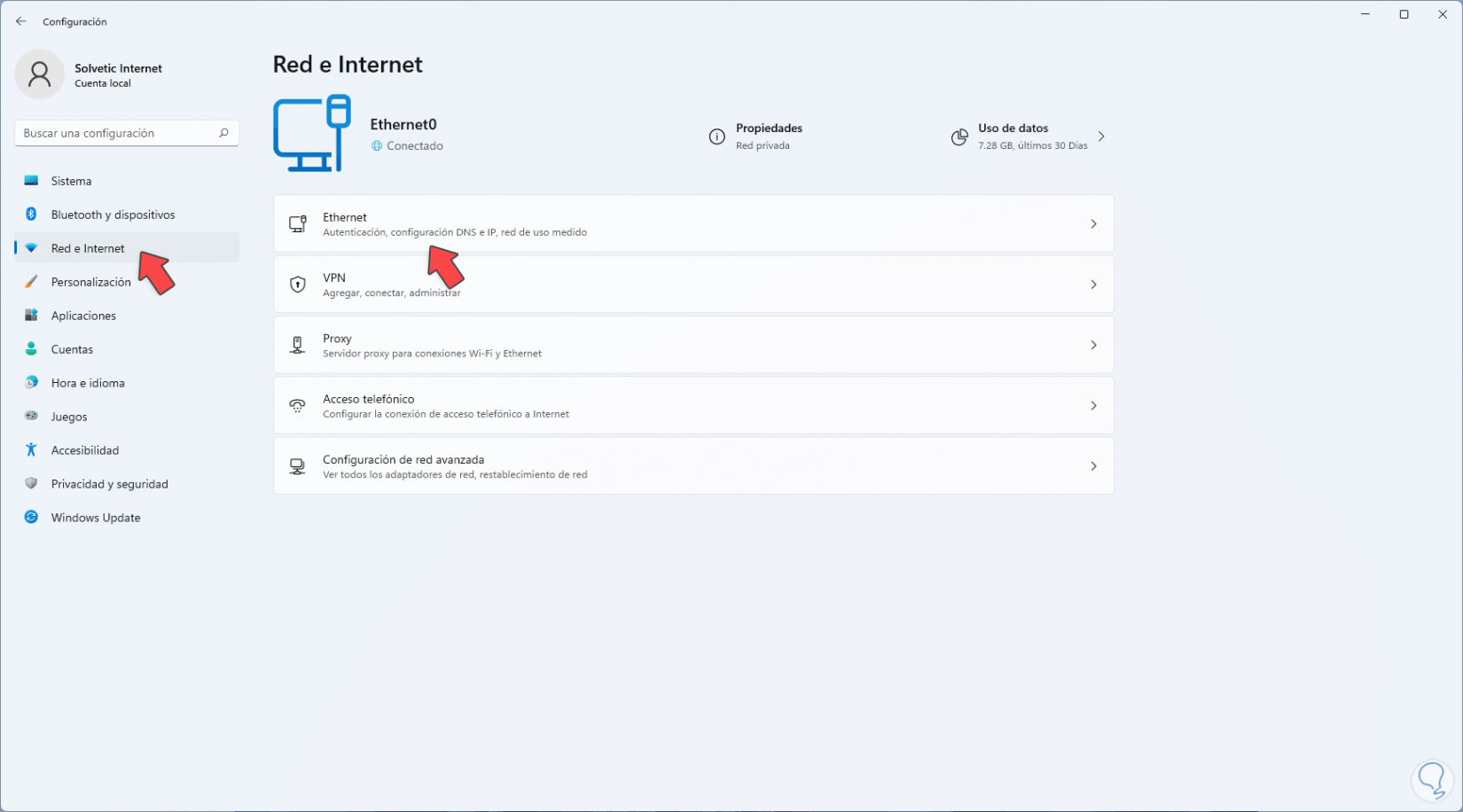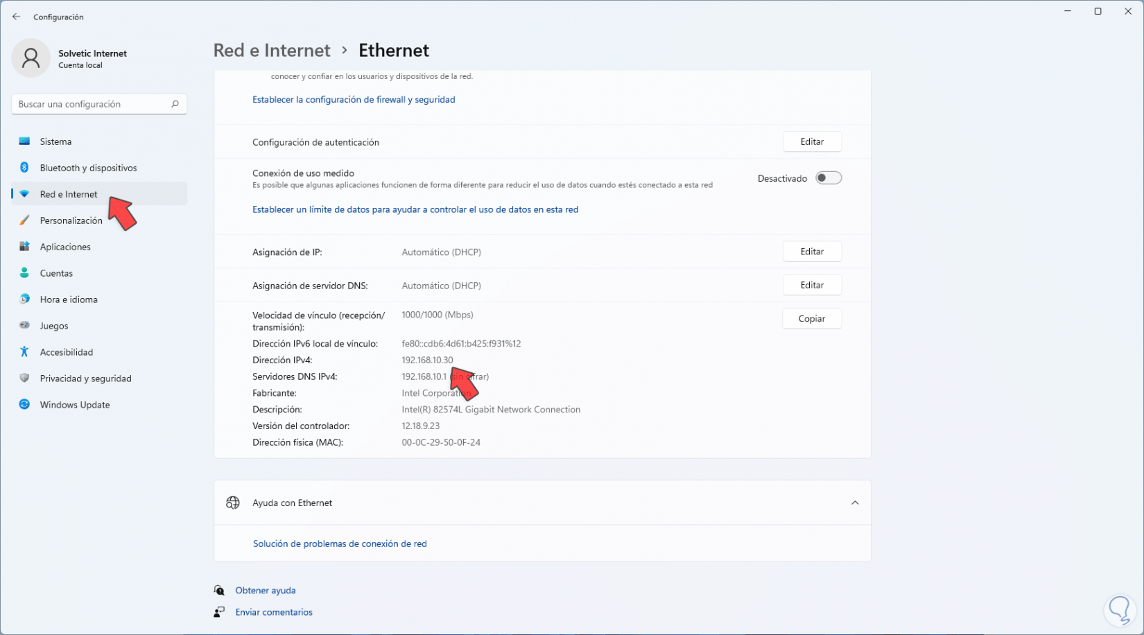 Luego vamos a “Red e Internet”. Pulsamos sobre la conexión actual (Ethernet o Wi-Fi)