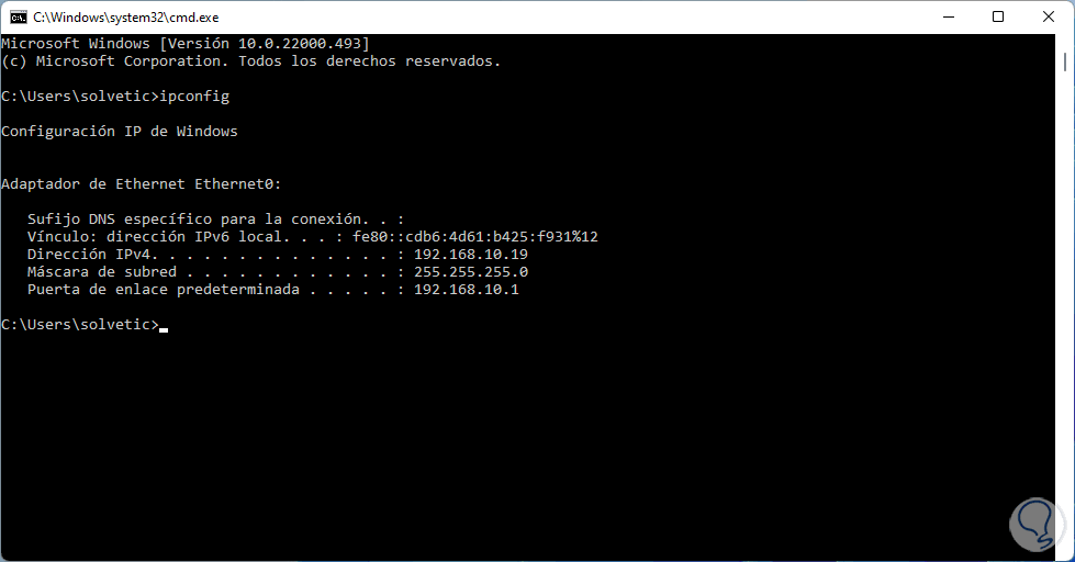 Ejecutamos lo siguiente. Allí encontramos la dirección IP de Windows 11.