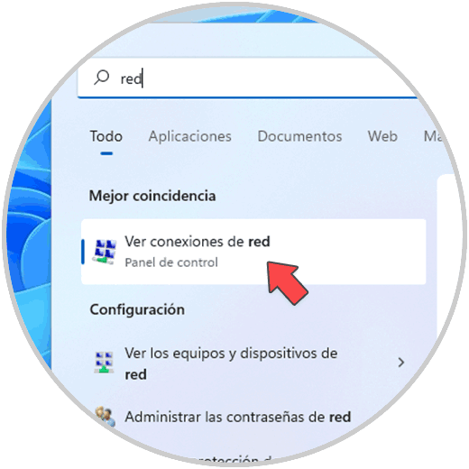 Es posible establecer la nueva dirección IP que vamos a usar desde el Panel de control a través de las opciones del adaptador, en el buscador ingresamos "red" y seleccionamos "Ver conexiones de red":