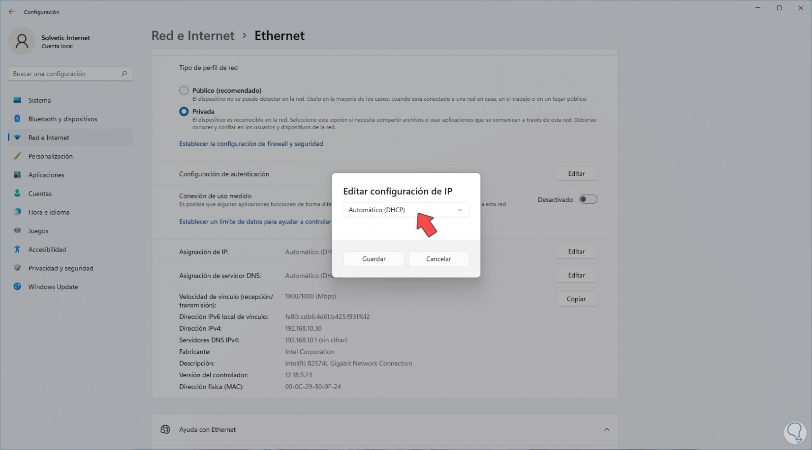 Pulsamos sobre la conexión actual y en la parte inferior de la siguiente ventana damos clic en "Editar" en "Asignación de IP":