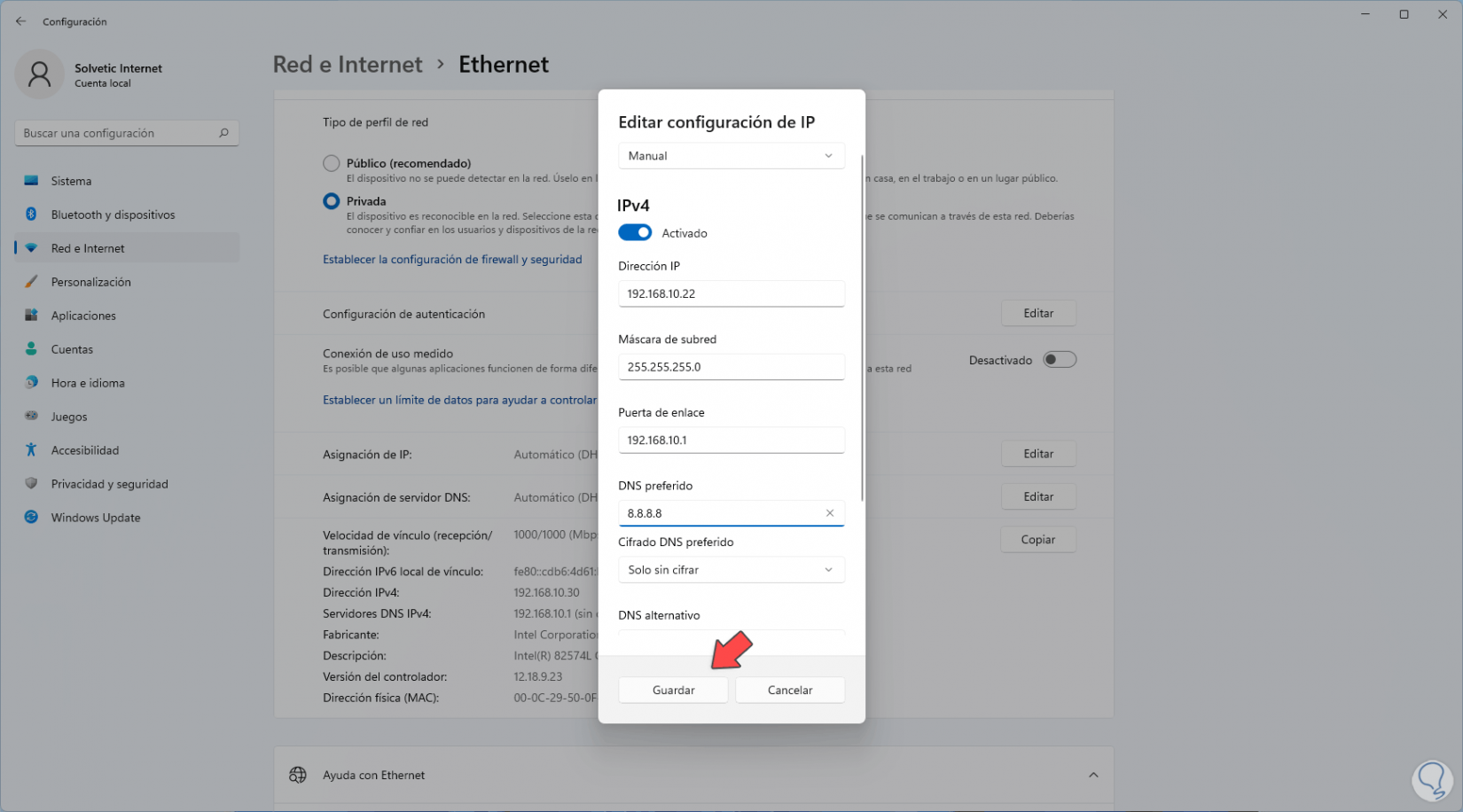 Activamos el interruptor IPv4 e ingresamos la dirección IP a usar
