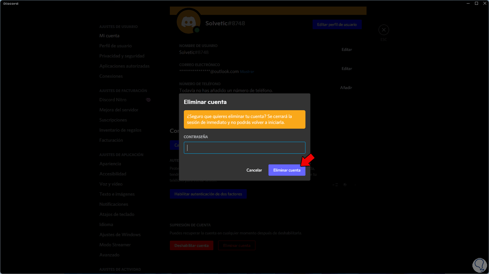 Será desplegado el siguiente mensaje. Ingresamos la contraseña de Discord y luego damos clic en "Eliminar cuenta" para finalizar el proceso.
