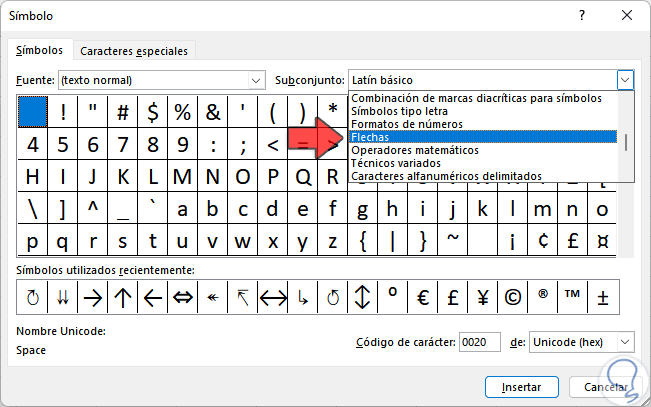 En la ventana desplegada, en la sección "Subconjunto" seleccionamos "Flechas":