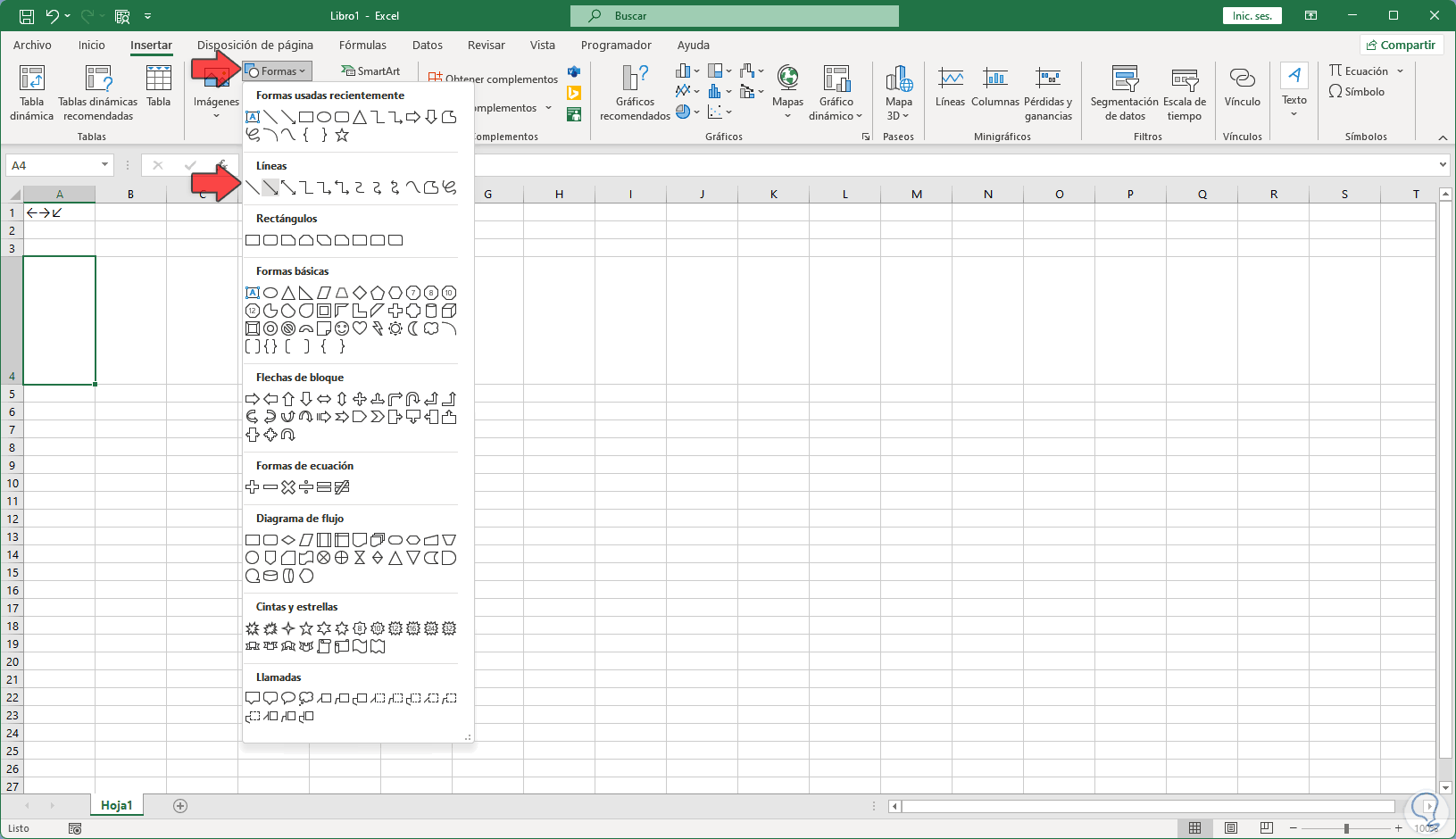 Al seleccionar esta opción podremos ver la cantidad de flechas disponibles para ser usadas en la hoja de cálculo. Seleccionamos la flecha deseada, damos clic en "Insertar".
