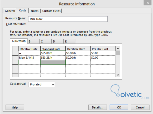 Como habíamos indicado, según el tipo de proyecto es probable que un recurso no cobre la misma cantidad de dinero durante el transcurso del mismo, si bien al inicio del cronograma podemos establecer el pago normal y el de horas o tiempo extra, este pago es fijo, por lo que si hay una disminución o aumento en el monto hay que establecerlo de otra forma.