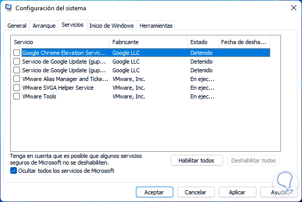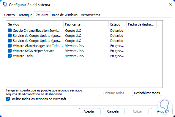 En la pestaña "Servicios" activamos la casilla "Ocultar todos los servicios de Microsoft":