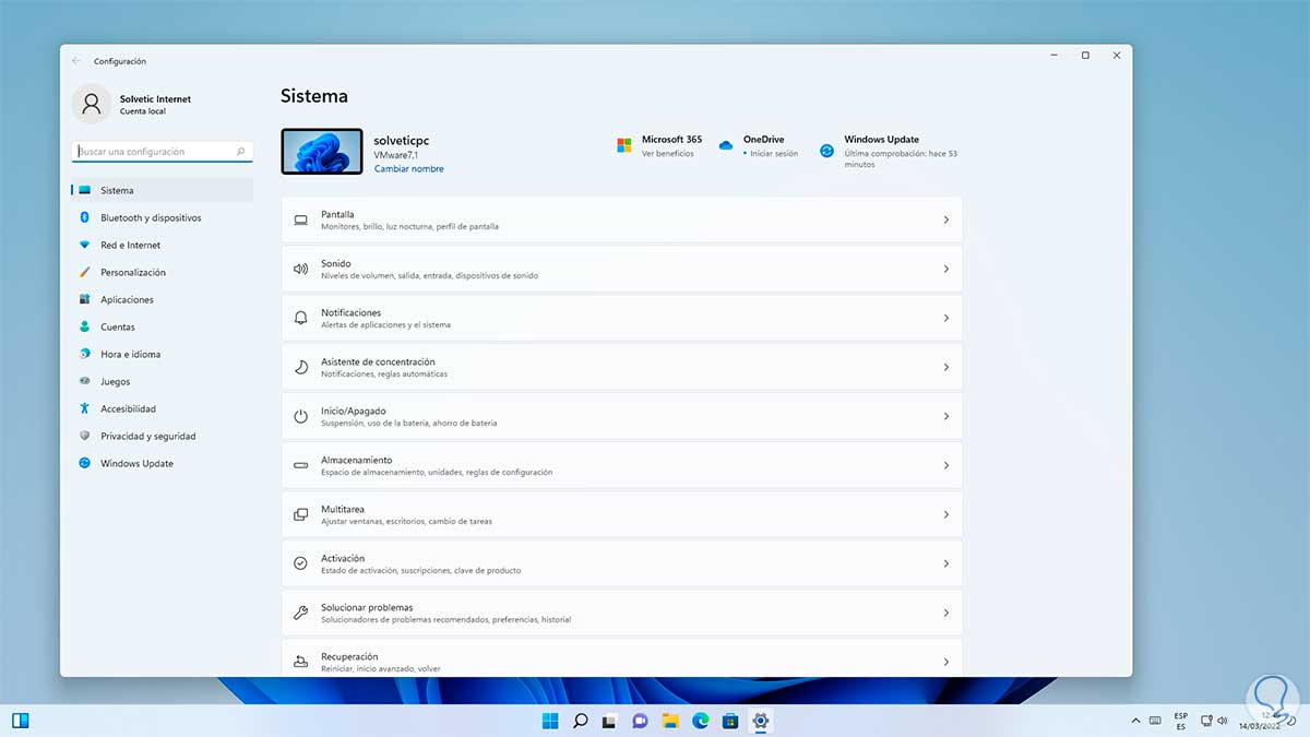 - Sistema, desde esa sección es posible acceder a gestiones de la pantalla, del sonido, de las notificaciones, el ahorro de la batería, gestionar el almacenamiento del sistema, activar el equipo, solucionar problemas o bien acceder a la información detallada del sistema operativo