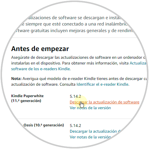 Iremos a la siguiente página de Amazon (link en descripción) y buscaremos nuestra versión de Kindle para "Descargar la actualización de software"