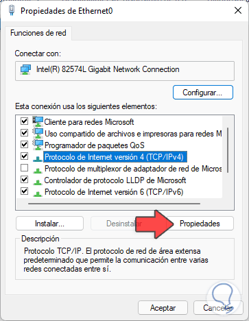 En la siguiente ventana que se abre, seleccionamos el Protocolo de Internet versión 4 y damos clic en "Propiedades":