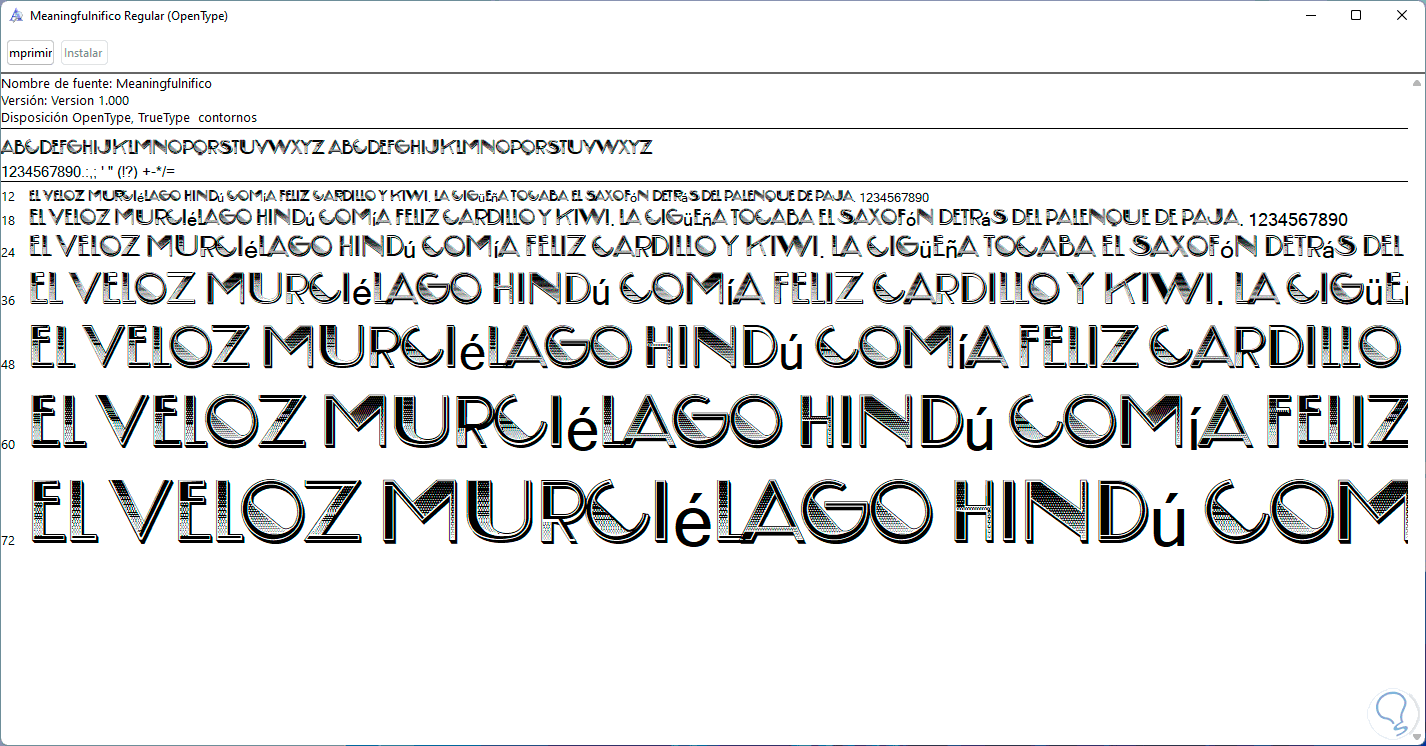 Damos doble clic sobre el archivo de la fuente y se abrirá una ventana emergente con todo el estilo de la fuente que hemos seleccionado: