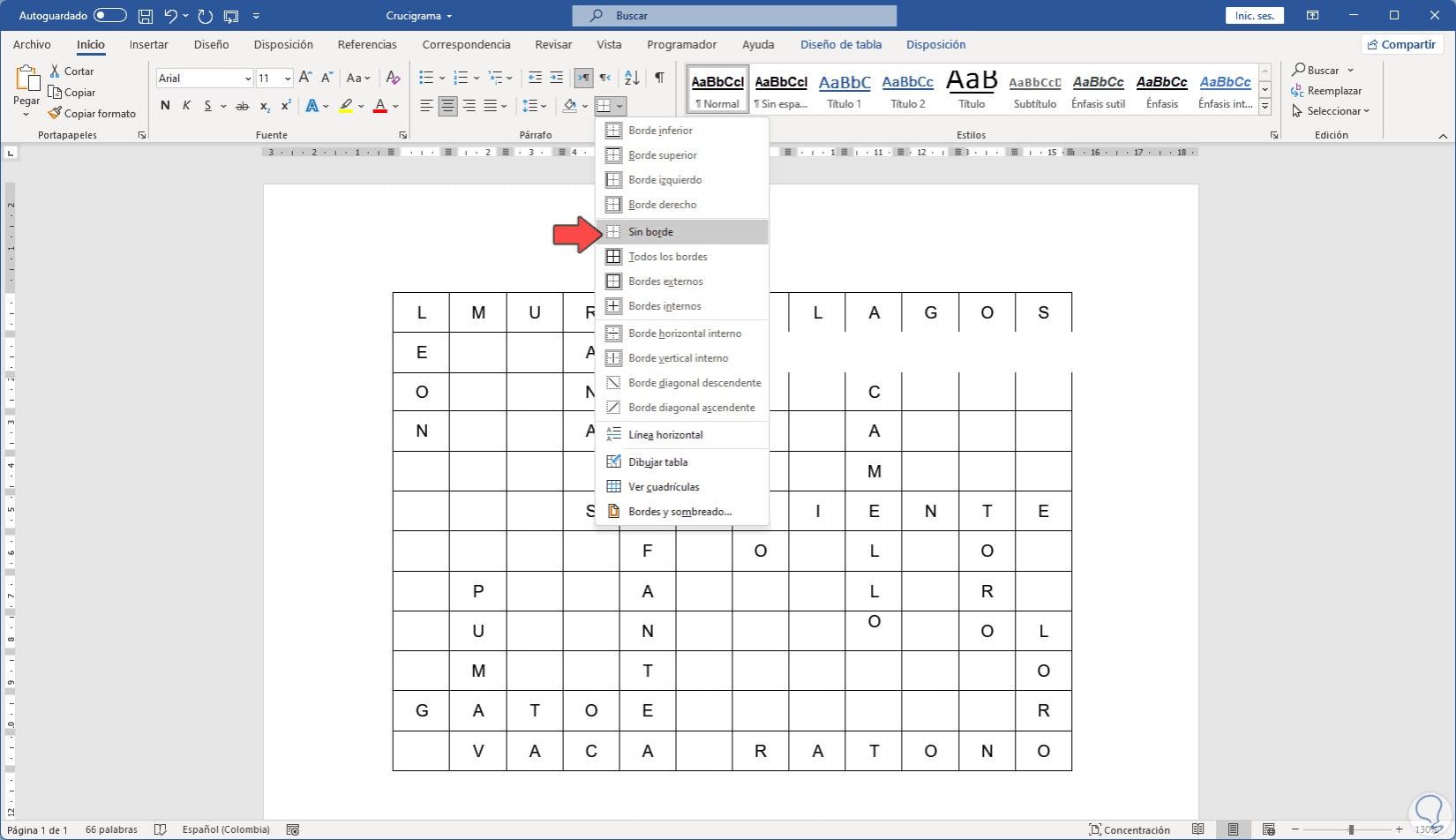 Seleccionamos cada recuadro libre y vamos a "Inicio" y en Bordes damos clic en "Sin Borde": Repite esto para cada espacio sin letras.