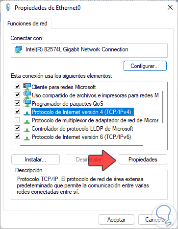 En la ventana emergente seleccionamos el protocolo IPv4 y damos clic en "Propiedades":