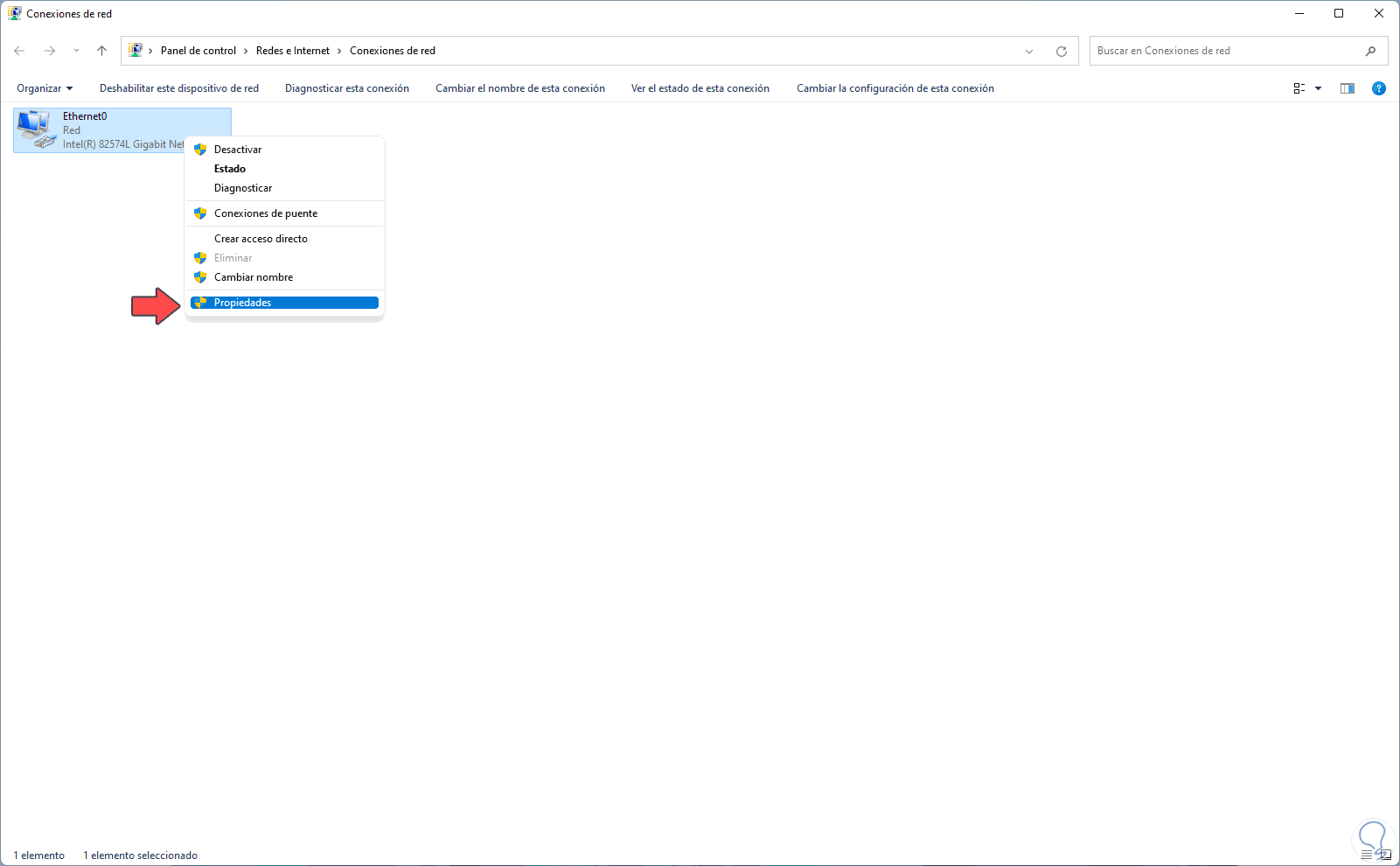 Seleccionamos el elemento, luego damos clic derecho sobre el adaptador de red y seleccionamos "Propiedades":