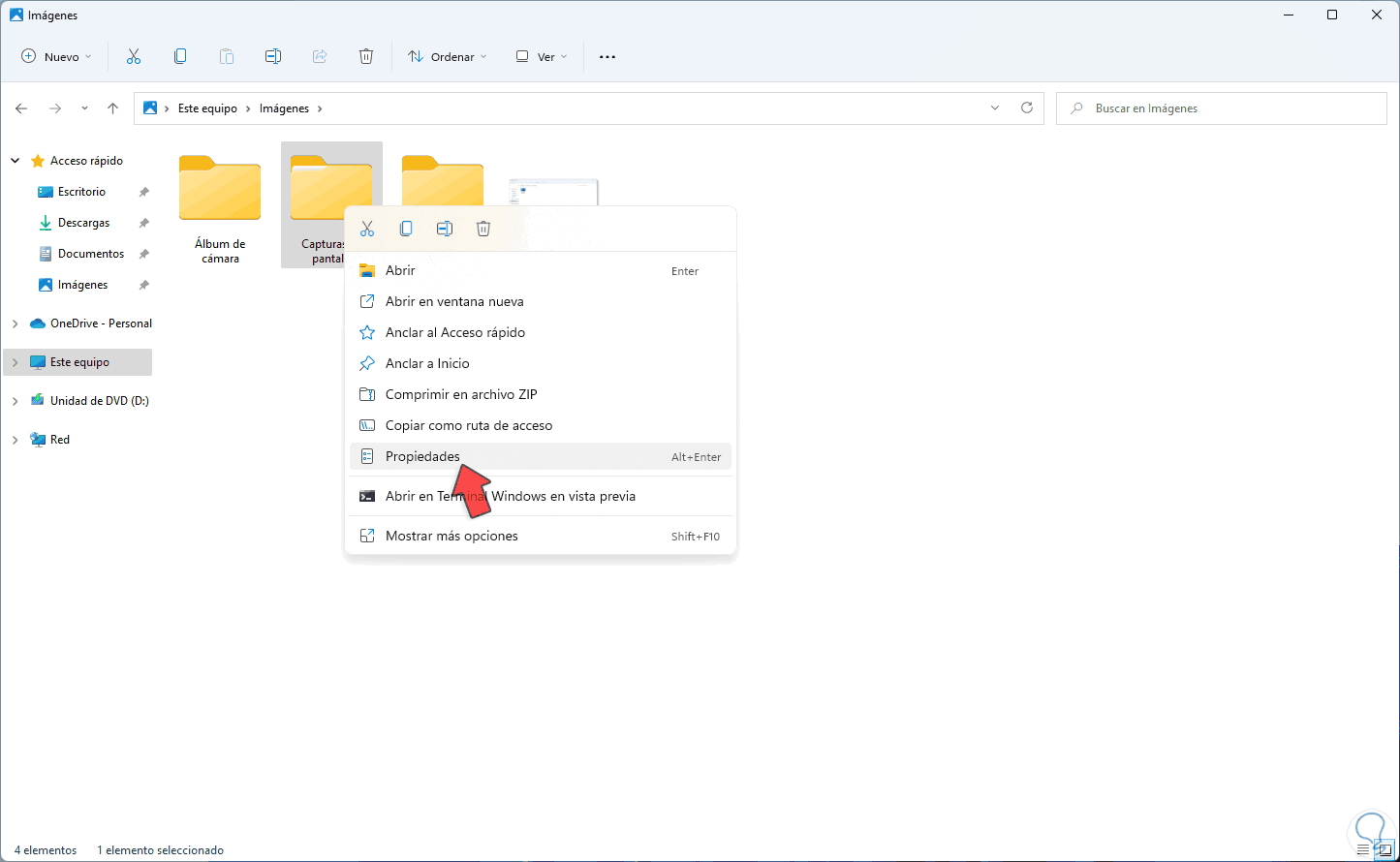 Para cambiar su ubicación, damos clic derecho sobre la carpeta Capturas de pantalla y seleccionamos "Propiedades":
