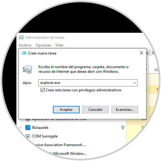 Ingresamos "explorer.exe" y activamos la casilla "Crear esta tarea con privilegios administrativos":