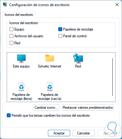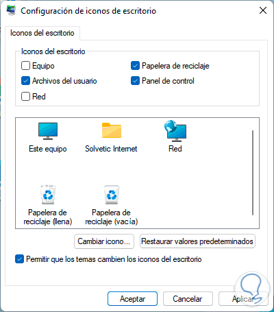 Damos clic en "Configuración de iconos de escritorio" y será abierta la siguiente ventana emergente: