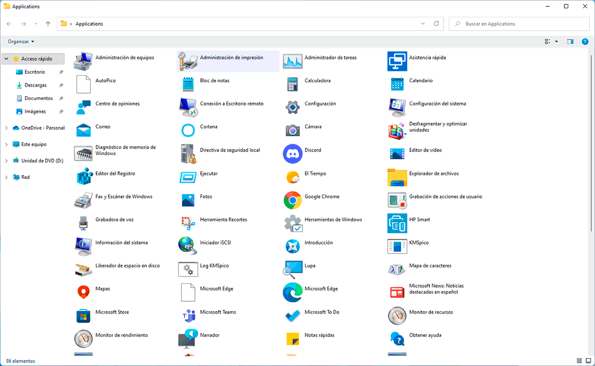 Será abierto una ventana con todos los accesos directos de los programas del sistema: